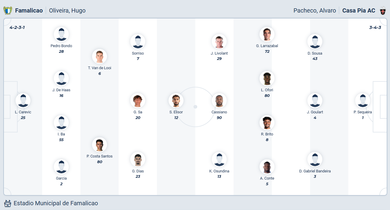 Casa Pia không phải đội bóng mạnh của giải vô địch Bồ Đào Nha, họ đứng thứ 9 mùa giải trước. Mùa giải này đội bóng của HLV Álvaro Pacheco chơi tệ hơn nhiều, họ từng trôi xuống nhóm cuối bảng và chuỗi trận ấn tượng thời gian gần đây chỉ giúp kéo lên vị trí thứ 13. Các cầu thủ Casa Pia thắng 2, hòa 2 ở 4 trận gần nhất và muốn tiếp tục chơi tốt để tiếp tục cải thiện thứ hạng của mình. Tuy nhiên chuyến làm khách trên sân của Famalicao ở vòng 23 được dự đoán không hề dễ dàng, nhiều khả năng Casa Pia sẽ đứt mạch bất bại.